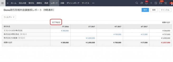 また、前述した「マトリクスレポート」の形式で各商談の総額を完了予定の月ごとに表示・集計させると下の画面のようになります。